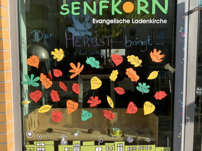 Für mich eine neue Stelle in der Ladenkirche und für euch? Das wollte ich wissen und habe einfach mal ausprobiert, was passiert, wenn ich bunte Blätter und Stifte ans Schaufenster hänge. Und siehe da – schon nach wenigen Tagen war das Fenster gefüllt mit euren Gedanken und Wünschen zum Herbst.