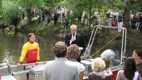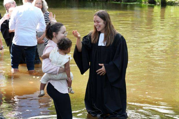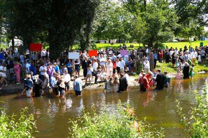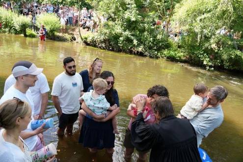Die Evangelische Kirche in Karlsruhe feierte am Sonntag, dem 7. Juli 2024, erneut ein großes Tauffest in der Günther-Klotz-Anlage. Dreizehn Pfarrerinnen und Pfarrer der evangelischen Gemeinden tauften in einem Open-Air-Gottesdienst rund 80 Täuflinge im fließenden Wasser der Alb, segneten sie, ihre Familien und Paten.