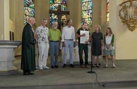 Im Stadtkirchenbezirk Karlsruhe hat jüngst die Evangelische Stadtkirchengemeinde Durlach die Zertifizierung mit dem „Grünen Gockel“ erhalten. Mitte September überreichte Manuel Pfoehler vom Büro für Umwelt und Energie (BUE) der Badischen Landeskirche die Zertifizierungsurkunde in einem Gottesdienst an das mehrköpfige Umweltteam um Pfarrer Thomas Abraham. Der Startschuss für dieses Umweltprojekt fiel an Erntedank 2021. In den zurückliegenden zwei Jahren bis zur Zertifizierung stand das BUE der Gemeinde in allen Fragen zur Seite.