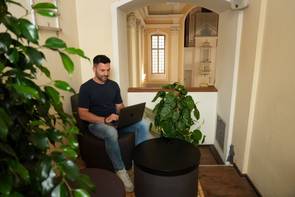 Wenn Diakon Daniel Paulus auf der umgebauten Empore der Kleinen Kirche seinen Laptop aufklappt, kann er sich aussuchen, wo er für die nächsten Stunden arbeitet. Ob auf der Couch, an einem Schreibtisch, auf der Kirchenbank, am Stehtisch oder doch lieber im Lounge-Bereich. Denn die Empore, die für gemeindliche Zwecke eher selten genutzt wurde, ist zum Co-Workingspace erweitert worden. Sieben mobile Arbeitsorte sind auf diese Weise entstanden.