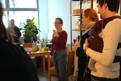 Zur Wiedereröffnung hatte Pfarrerin Magdalena Prinzler das Schaufenster der Senfkorn-Ladenkirche mit Zeitungspapier abgeklebt – extra für die Kinder. Denn das war eine der Aktionen an diesem Tag: Gemeinsam mit den Kindern entfernte sie die Zeitungen vom neuen Schaufenster der Ladenkirche in der Anna-Lauter-Straße 13, um zu zeigen: Der Umbau ist vorbei. Dann öffneten sich die Tür zur neu eingerichteten Ladenkirche. Im Inneren, einem rund 60 Quadratmeter großen Raum, wurde dann mit den Familien auf die Wiedereröffnung angestoßen.