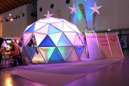 Die Besucher waren dabei eingeladen, selbst Teil des Erlebnisses zu werden: Dafür stand das begehbare Kaleidoskop mit seiner mehrfachen Verspiegelung. Wer ihn betrat, konnte sich achtfach sehen – was ein beliebtes Motiv für Handyfotos und ein „Türöffner“ war, mehr von dem Kunstwerk sehen zu wollen. Die Kuppel selbst lud zum Mitgestalten ein. Wer wollte, konnte am Fächersegen-Stand bunte Sterne falten oder zusammenstecken, um sie mit nach Hause zu nehmen oder eben in die Kuppel zu hängen. So wuchs ein gemeinsames Kunstwerk, das zeigt: Auch du bringst Licht ins Ganze. Zum Mitnehmen gab es noch Kärtchen, deren Botschaft man freirubbeln musste. Dahinter verborgen lagen sechs verschiedene Lichtbotschaften als Give-away nach dem Motto: Lass dich ermutigen!